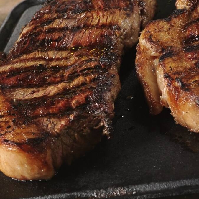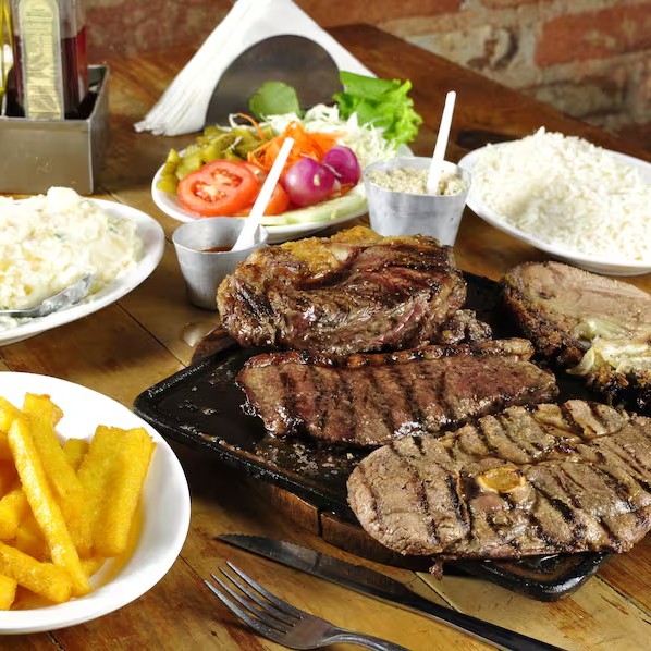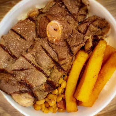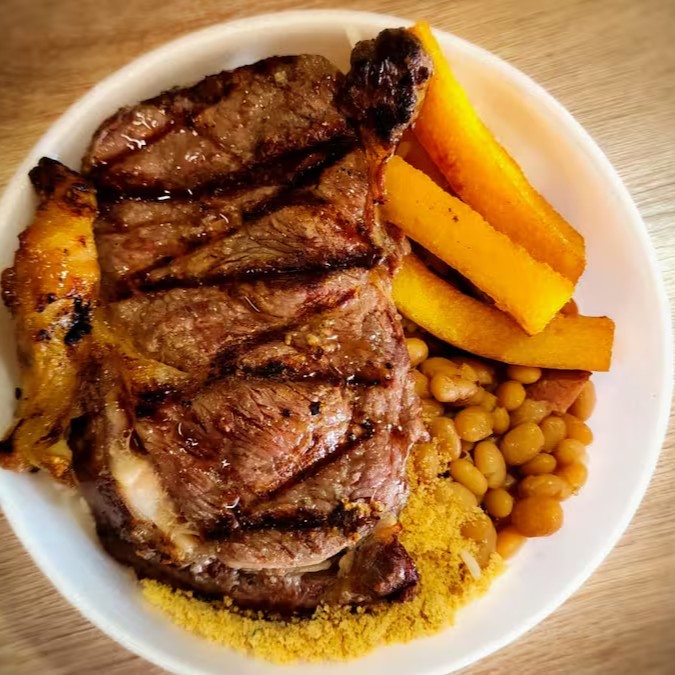 O 'Bife de Chorizo Completo' é uma suculenta carne de 600 a 700gr, cuidadosamente grelhada na brasa para preservar seu sabor autêntico. Ele é generosamente acompanhado por um arroz perfeitamente cozido, uma polenta frita crocante e uma maionese caseira cremosa. Acompanha também uma salada mista verde, fresca e vibrante, contribuindo para um equilíbrio perfeito de sabores. E para adicionar um toque especial, o prato é finalizado com uma deliciosa farofa artesanal, oferecida como brinde. Uma verdadeira experiência culinária completa!