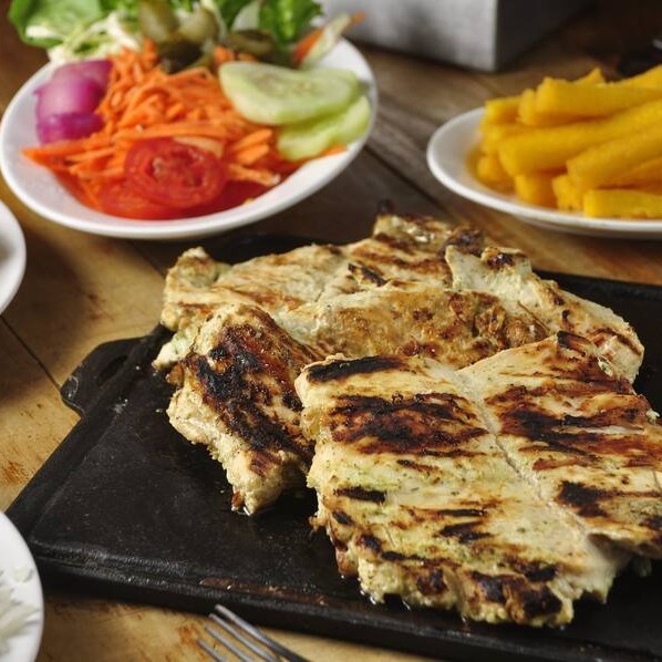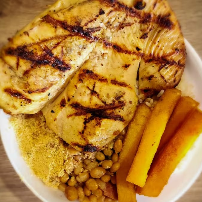 Apresentamos o 'Frango Completo', uma opção requintada e substanciosa na categoria de 'Pratos'. Um suculento filé de peito de frango, sem osso, cuidadosamente grelhado na brasa, pesando entre 600 a 700 gramas. É gloriosamente acompanhado por um arroz branco leve e fofinho, polenta frita crocante e dourada, além de uma maionese caseira cremosa e aveludada. Para completar, uma salada mista verde vibrante e fresca. Como cortesia, incluímos uma farofa artesanal, preparada com amor e carinho, para realçar ainda mais o sabor deste prato completo.