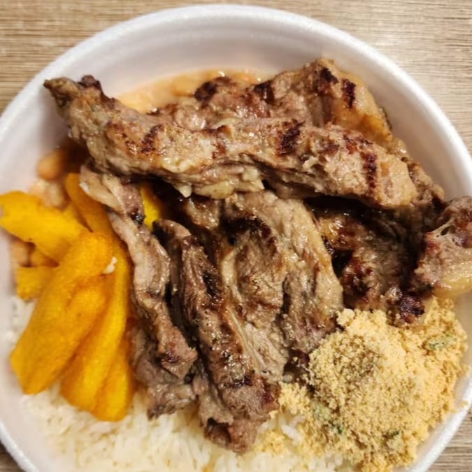 Delicie-se com a nossa Marmitex Com picanha, uma opção sublime para os amantes de carne. Com um total de 200g de Bananinha grelhada de forma primorosa, este prato apresenta um sabor irresistível e uma textura suculenta. Acompanha arroz fresco e bem temperado, feijão saboroso que é um clássico da culinária brasileira, polenta frita crocante e uma deliciosa farofa. E se desejar favor solicitar uma refrescante salada verde ou nossa maionese (favor solicitar em seu pedido). Uma combinação perfeita para uma refeição completa e gratificante.