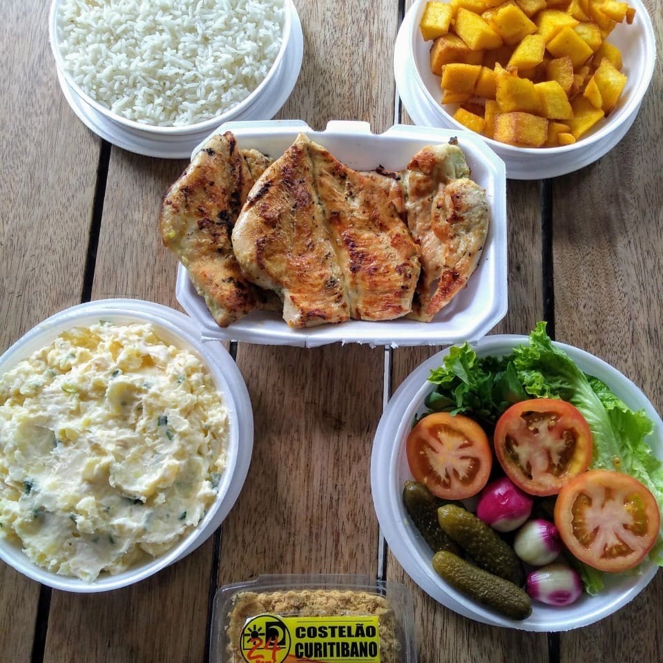 File de frango assado, arroz, polenta , salada, maionese e farofa (serve 2 pessoas)