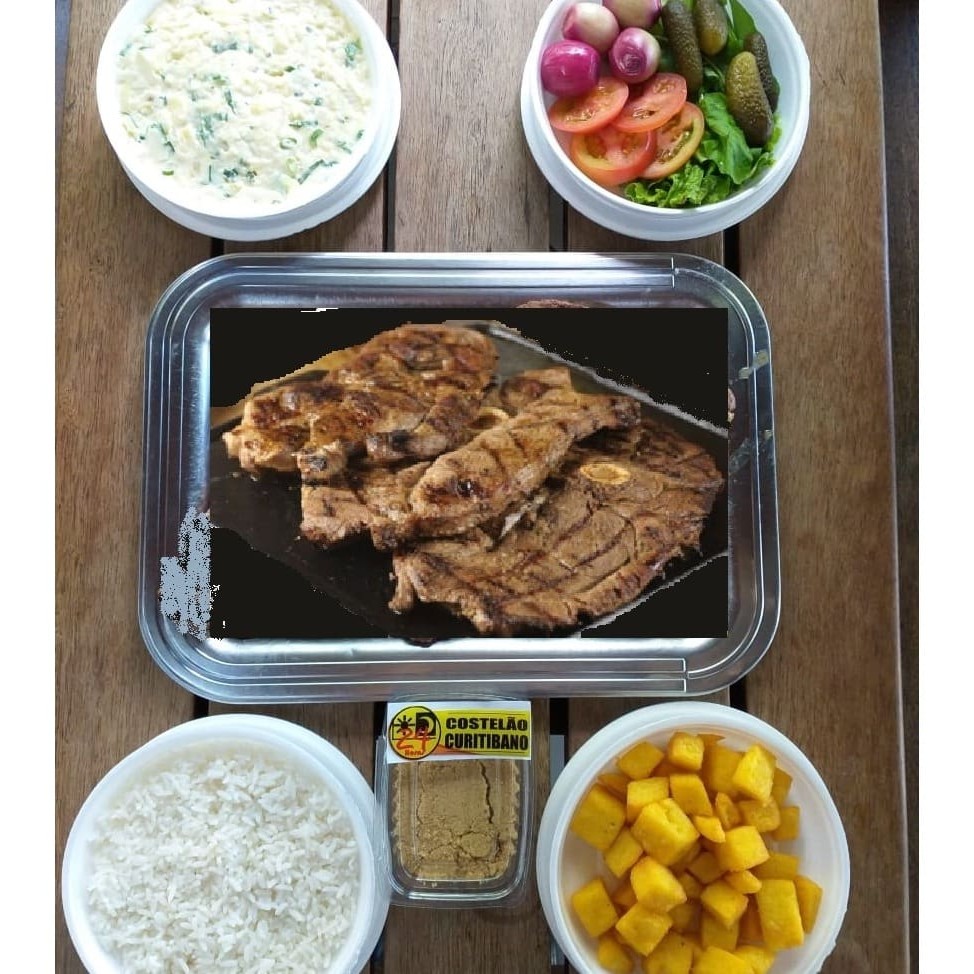 Pernil de carneiro,arroz, polenta frita, salada , maionese e farofa