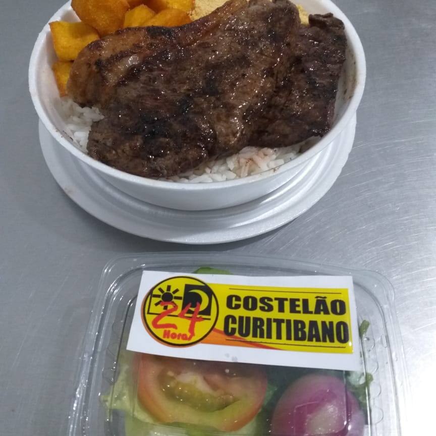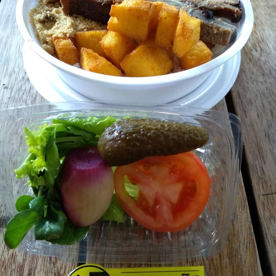 Costela. Arroz, feijão, polenta frita e forofa (com salada)