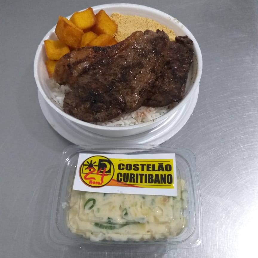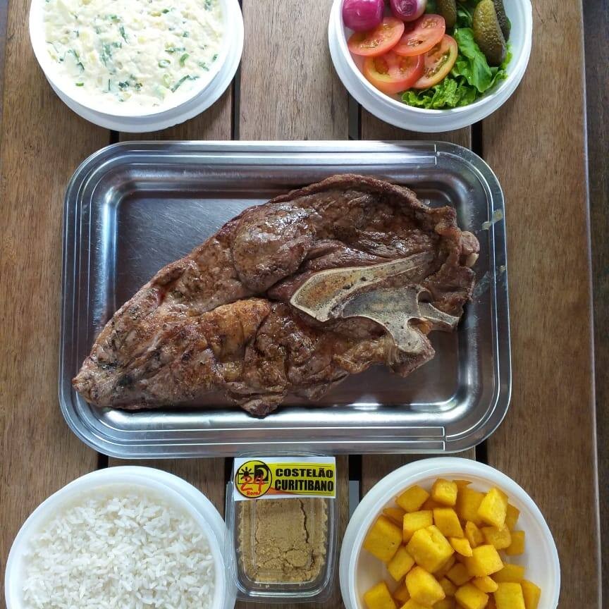 Alcatra, arroz, polenta, maionese, salada, farofa