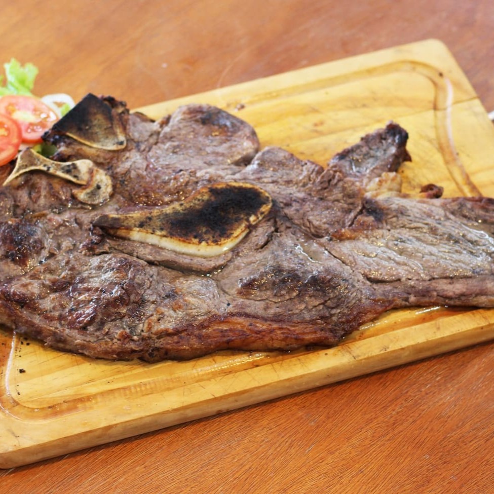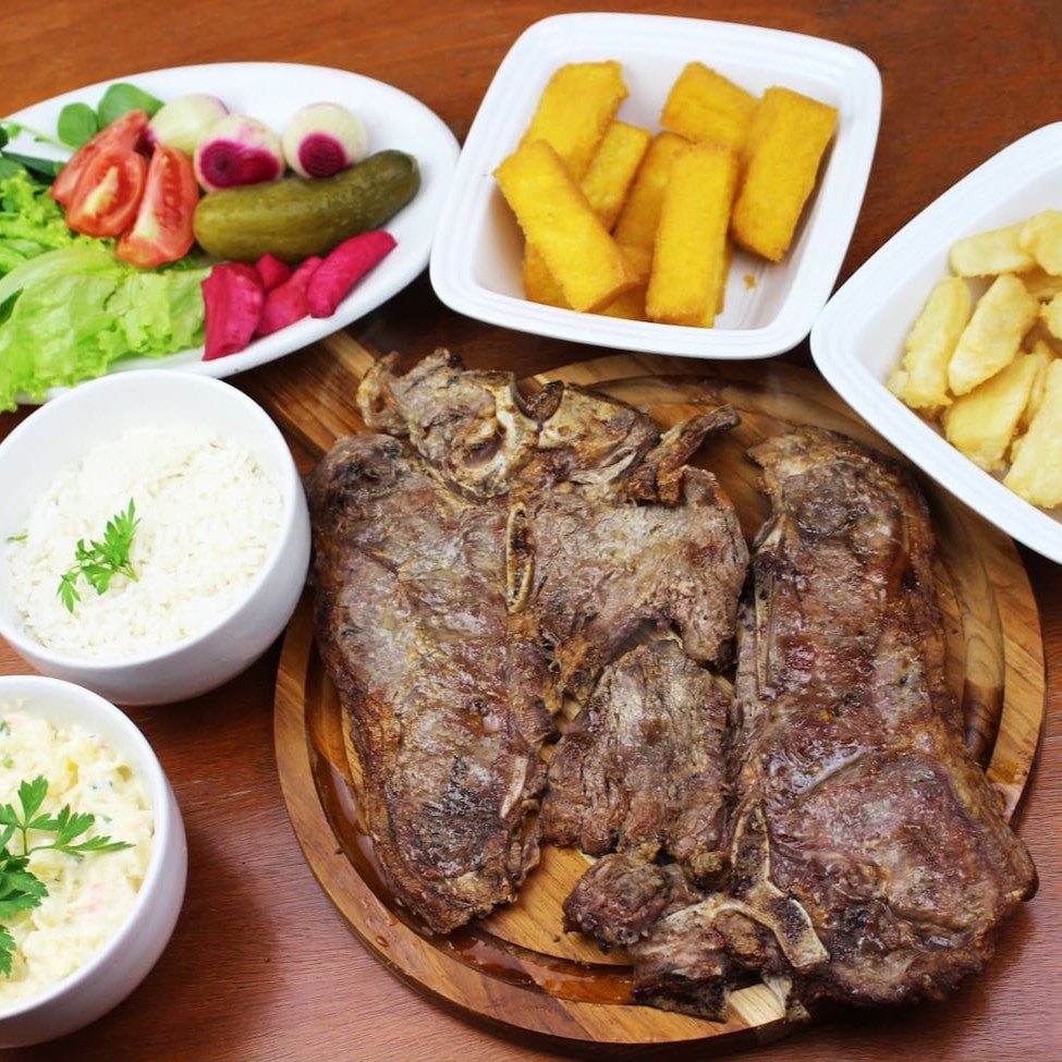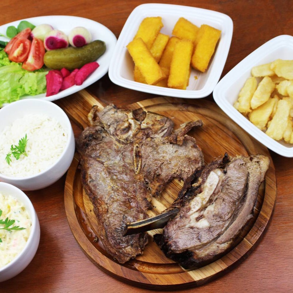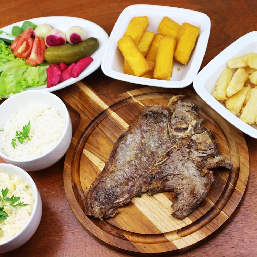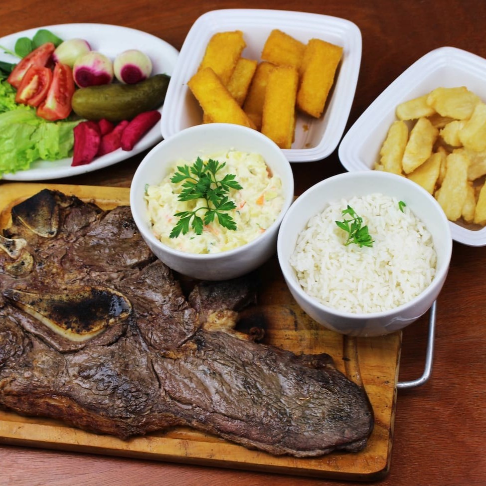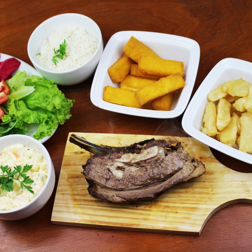 1 fatia de costela (aproximadamente 250 gramas), 1 filé, 300 gramas de maionese, 300 gramas de polenta frita, 300 gramas de aipim frito, 300 gramas de arroz e uma salada mista pequena