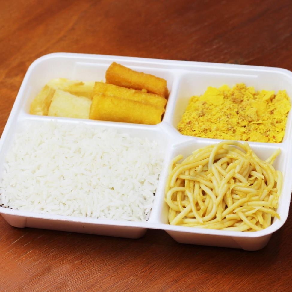 Marmita 3 divisórias arroz, feijão, macarrão, polenta, aipim, farofa. acompanha 1 fatia de costela 150g ou 1 peça de frango. opcional de salada ou maionese 100g.