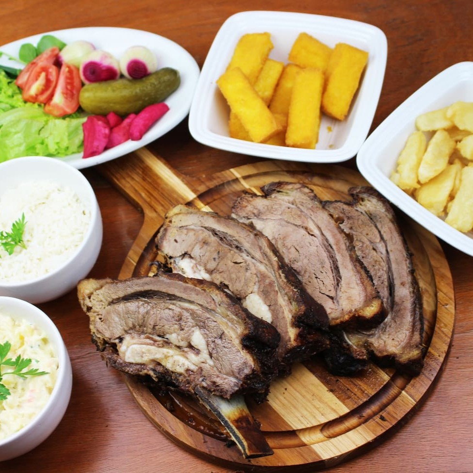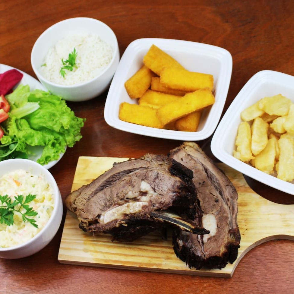 1 fatia de costela (aproximadamente 250 gramas), 150 gramas de maionese, 150 gramas de polenta frita, 150 gramas de aipim frito, 150 gramas de arroz e uma salada mista pequena.
