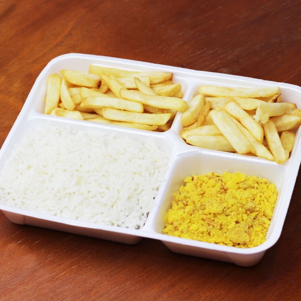 1 filé (350g), 150 gramas de maionese, 150 gramas de polenta frita, 150 gramas de aipim frito, 150 gramas de arroz e uma salada mista pequena