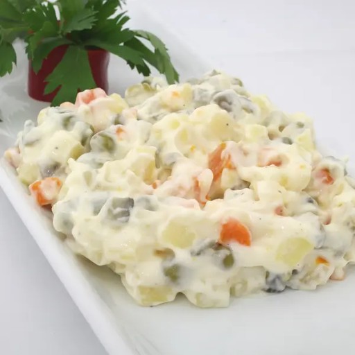 batata cozida, molho maionese, cenoura ralada, milho e cebolinha para decorar