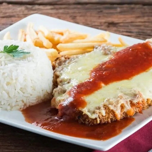 2 bifes à parmegiana, arroz e 300g de maionese.