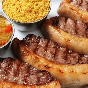 Acompanhamentos: Arroz, feijão preto ou branco, macarrão, farofa, abobrinha refogada, mandioca frita e porção de salada.