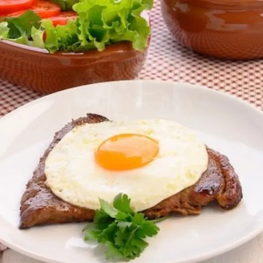 1 bife feito na chapa, com um ovo feito na chapa (sempre feitos ao ponto, caso queira mal passado solicitar nas observações)