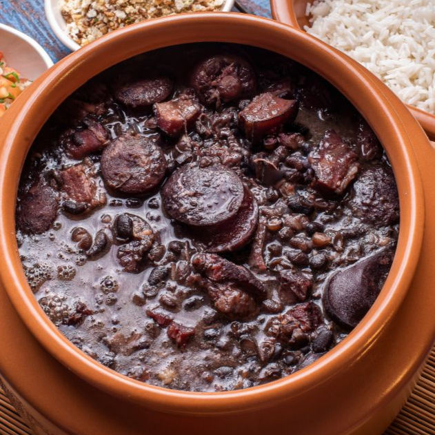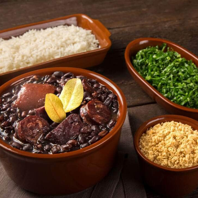 1 kit de feijoada que consiste em: 1 porção de feijoada média, 1 porção de arroz média, 1 porção média com: couve refogada, banana a milanesa, farofa e mandioca frita, vinagrete e pururuca.