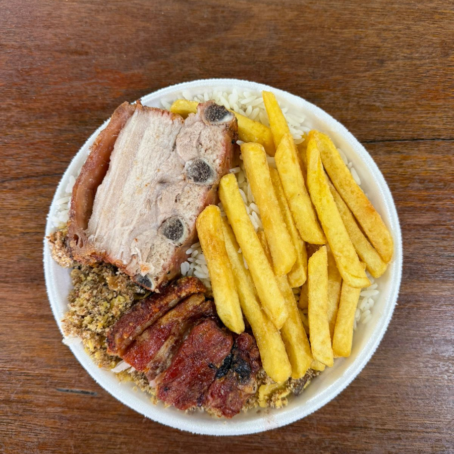 180g De Costela Assada 200g Arroz +Feijão +Batata Frita +Porçao De Farofa +Salada Do Dia Padrão 1 Linguiça