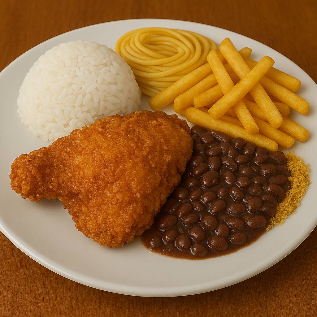 Serve 1 pessoa (700g) Acompanha Arroz, Feijão, Macarrão do Dia, Batata frita, Farofa e Salada