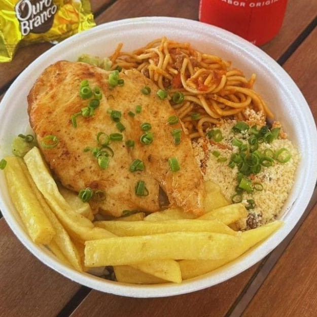 File de Frango Grelhado, Arroz Branco, Feijão Fresco, Farofa, Macarrão do Dia, Legumes do Dia e Batata Frita * A mais Completa da Região* - Faça seu Pedido!