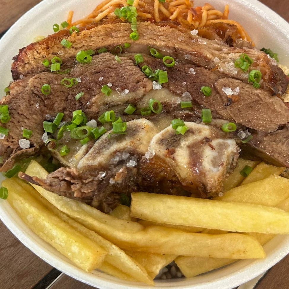 Costela Assada, Arroz Branco, Feijão Fresco, Farofa, Macarrão do Dia, Legumes do Dia e Batata Frita *A mais Completa da Região* - Faça seu pedido!