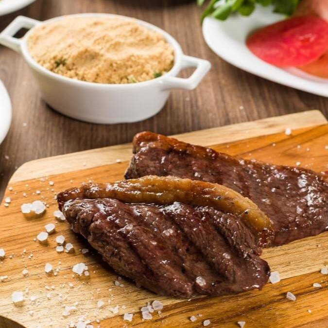 Alcatra assada na brasa (500g in natura) + arroz branco (500g) + maionese de batata (500g) + fritas (200g) + salada + farofa