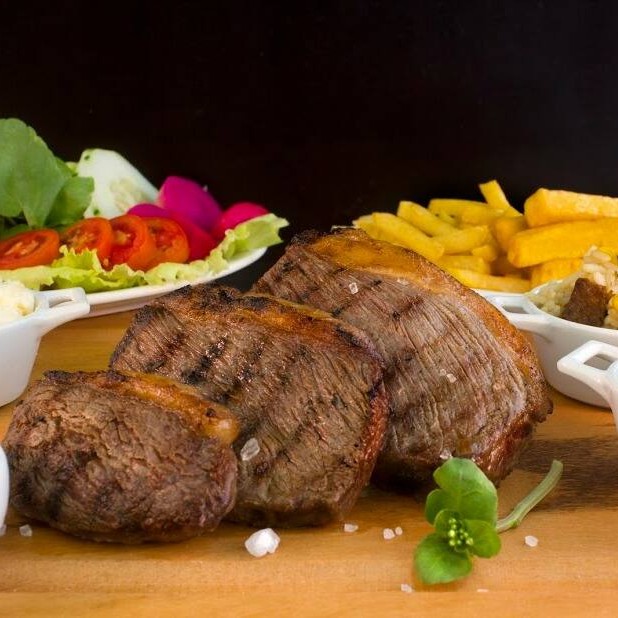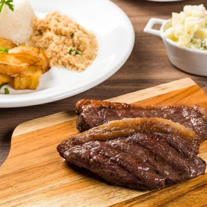 Filé argentino assado na brasa (500g in natura) + arroz branco (500g) + maionese de batata (500g) + fritas (200g) + salada + farofa
