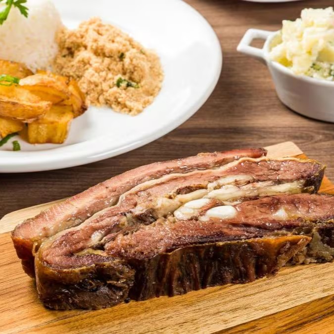 Costela bovina assada na brasa (200g) + arroz branco (200g) + maionese de batata (200g) + fritas (50g) + salada + farofa