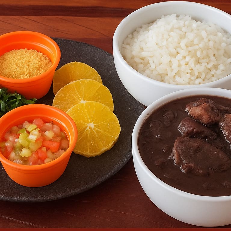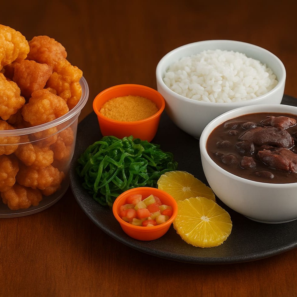 Nossa receita é coisa fina! A gente pega o feijão preto e deixa ele cozinhar devagarinho, até ficar naquela cremosidade de dar água na boca. Aí, vem a estrela do trem: carne de porco, linguiça defumada e carne desfiada, tudo temperadim com um punhado de especiaria que traz o autêntico sabor mineiro. E num é só isso, cê ainda ganha um prato de arroz branquinho e soltinho, couve refogada, umas laranjas cortadinha, vinagrete e uma farofa que só vendo, que dá uma textura danada de boa, e ainda enviado separadamente. Não perde essa chance, sô! Pede a nossa feijoada agora e deixa o coração se aquecer com essa viagem de sabores. A gente leva a tradição e o sabor direto pra sua porta, pode acreditar!