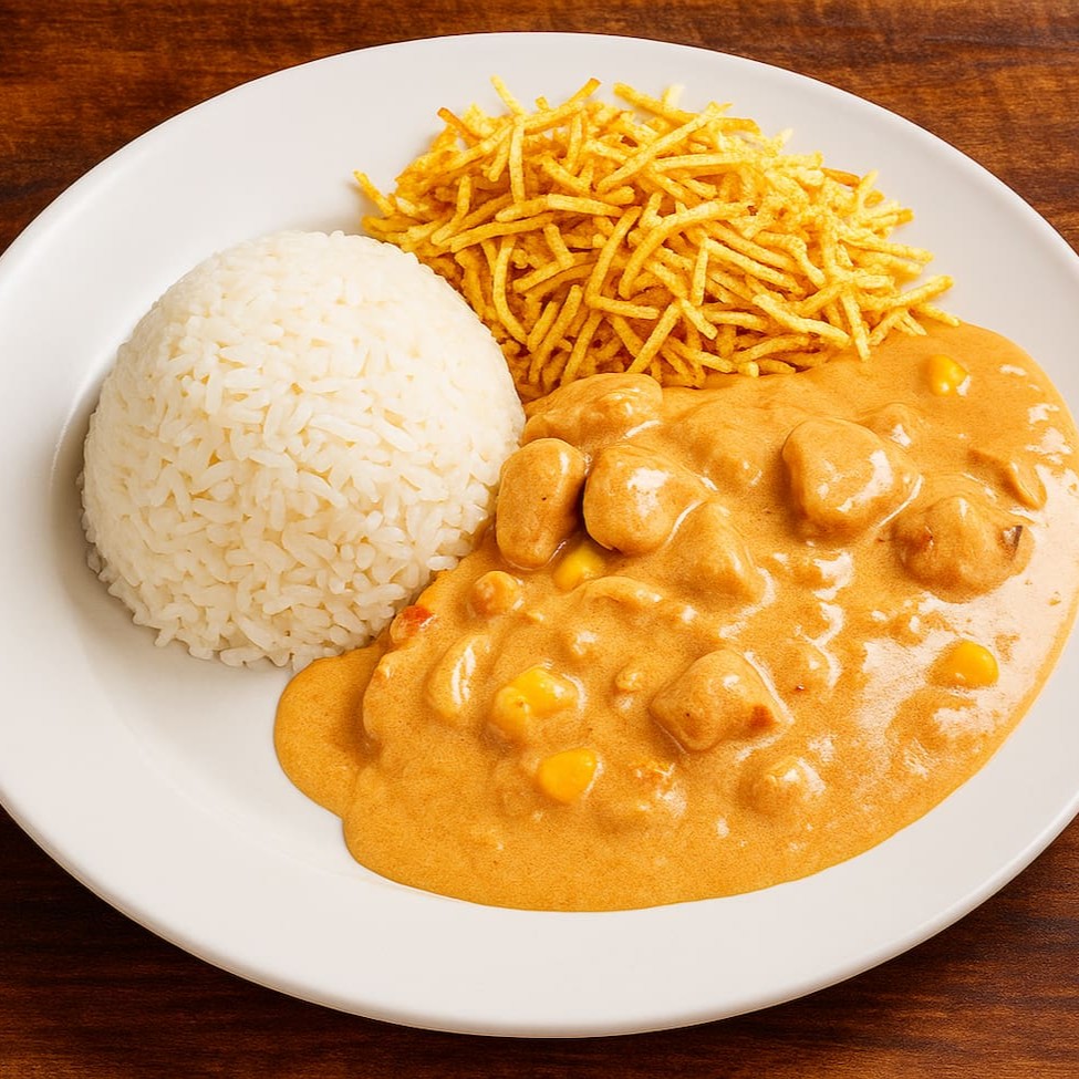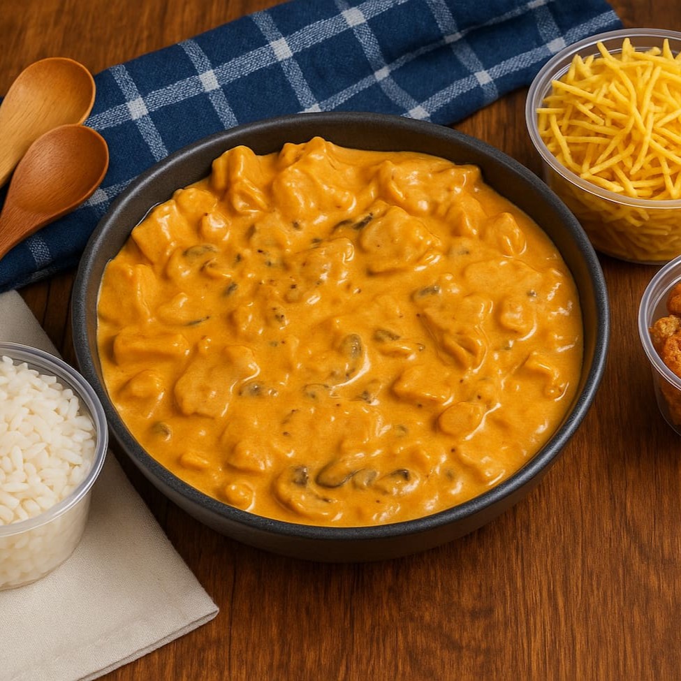 Cremoso strogonoff de frango com arroz branco, tudo juntim pra facilitar a vida. Batata palha crocante separadinha pra não perder o croc. É comida caseira com aquele toque mineiro que você respeita!