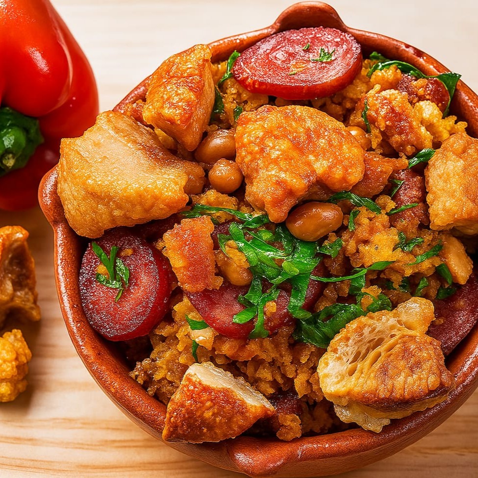 Imagina só uma mistura dessas: feijão cozido, uma farofinha daquelas bem feitas, linguiça calabresa, bacon, cebola, pimentão, torresmo que 'estoura' na boca, ovos e um tempero que é coisa de cinema. Tudo isso é preparado com carinho, numa refogada de respeito, pra fazer um prato que é puro sabor, cremosidade e um tantinho de crocância. Cada garfada é uma viagem no trem da nossa rica culinária de Minas, com suas tradições e histórias. O Feijão Tropeiro é muito mais que comida, é a herança da terra, é um pedacinho do coração da cozinha mineira.