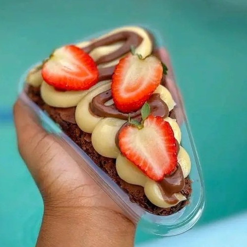 Delicioso afogadinho de brownie com creme de ninho ,pedaços de brownie e morangos picados.