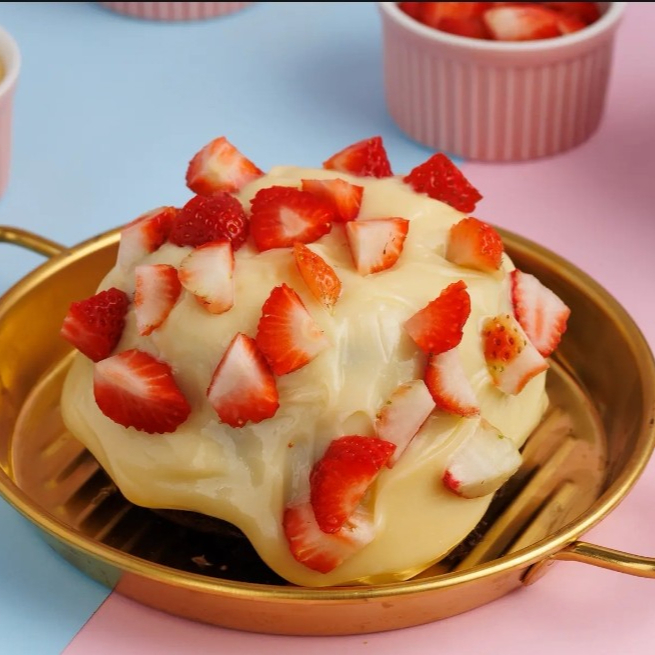 Delecioso mini vulção mssa brnc bem fofinha com recheio de brigdeiro cremoso de ninho com cubos de morangos .peso 300 gr ,porção inividual