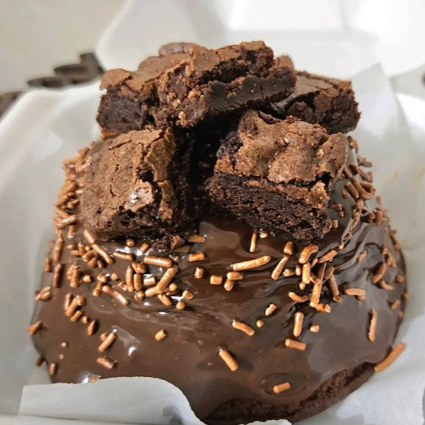 Delecioso mini vulcão com massa de chocolate recheio de brigadeiro cremoso e finalizado com cubos de brownie.peso 300gr porção individual