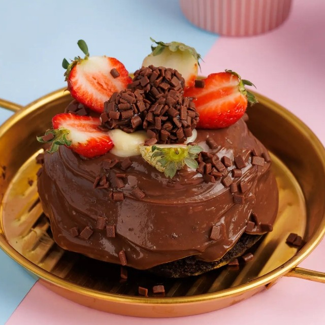 Delecioso mini bolo vulcão de massa de chocolate com recheio de brigadeiro cremoso em cima decorado com brigadeiros e morangos .peso 300 gr porção individual
