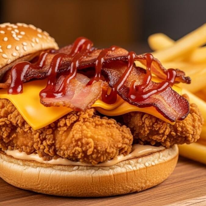 O pão com dois filézinhos de frango crazy temperados com especiarias, a empanação (técnica secreta) proporciona uma crocância única sem exageros, nossa maionese artesanal trazendo um defumado espetacular, fatia de queijo cheddar, bacon finalizado com molho barbecue. O Acompanha batata frita palito 100g.