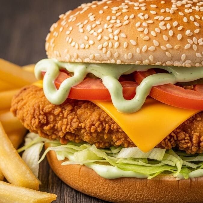O pão com dois filézinhos de frango crazy temperados com especiarias, a empanação (técnica secreta) proporciona uma crocância única sem exageros, nossa maionese artesanal trazendo um defumado espetacular, mix de salada (Alface, repolho roxo e cenoura), fatia de cheddar, finalizado com molho verde. O Acompanha batata frita palito 100g.