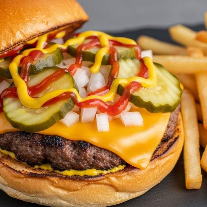 Pão brioche selado, maionese crazy, smash burguer artesanal com 90g temperados ao estilo crazy, queijo cheddar, picles, cebola, ketchup e mostara. Acompanha 100g de batata frita palito.