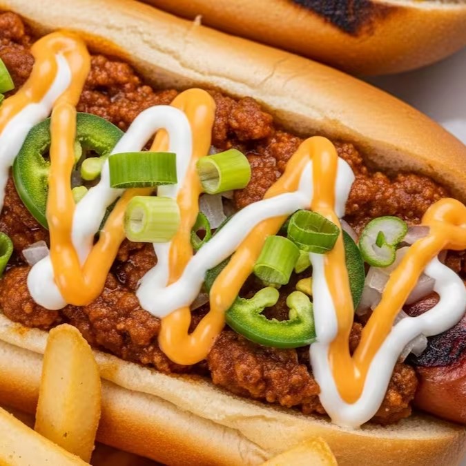Um delicioso pão de hot dog com a nossa maionese crazy defumada, salsicha fininha, molho de tomate artesanal, clássica carne com chilli e feijão vermelho mexicana, combinados com molho sour cream, cheddar e para finalizar, pimentas jalapenos trazenddo a picância. Acompanha batatas fritas palito 100g.