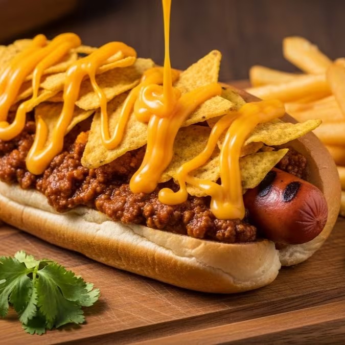 Um delicioso pão de hot dog com a nossa maionese crazy defumada, salsicha fininha, molho de tomate artesanal, clássica carne com chilli e feijão vermelho mexicana, combinados com Doritos, molho cheddar para finalizar, Acompanha batatas fritas palito 100g.
