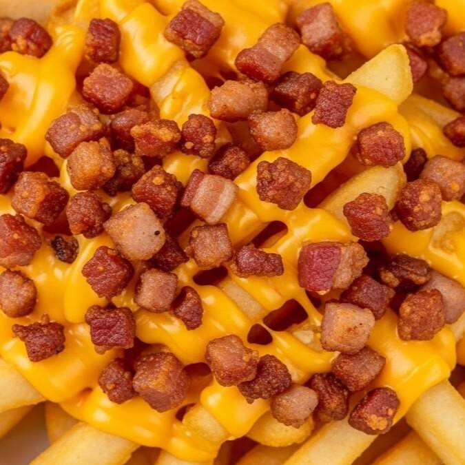 Batatas fritas 300g, cobertas com delicioso cheddar cremoso, finalizado com bacon.