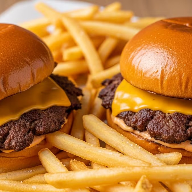 São 2 Smash Cheddar com batata frita palito e aquele descontinho caprichado!