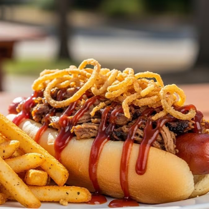 Um delicioso pão de hot dog com a nossa maionese crazy defumada, salsicha fininha, molho de tomate artesal, um suculento pernil suíno desfiado com tesperos estilo americano, molho barbecue, finalizao com pedaços de cebola crispy. Acompanha batatas fritas palito 100g.
