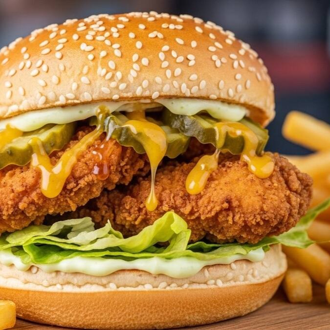 O pão com dois filézinhos de frango crazy, temperados com especiarias, a empanação (técnica secreta) proporciona uma crocância única sem exageros, nossa maionese artesanal trazendo um defumado espetacular, alface picada, molho verde, picles agrioce, finalizado com molho honey mustard. O Acompanha batata frita palito 100g.