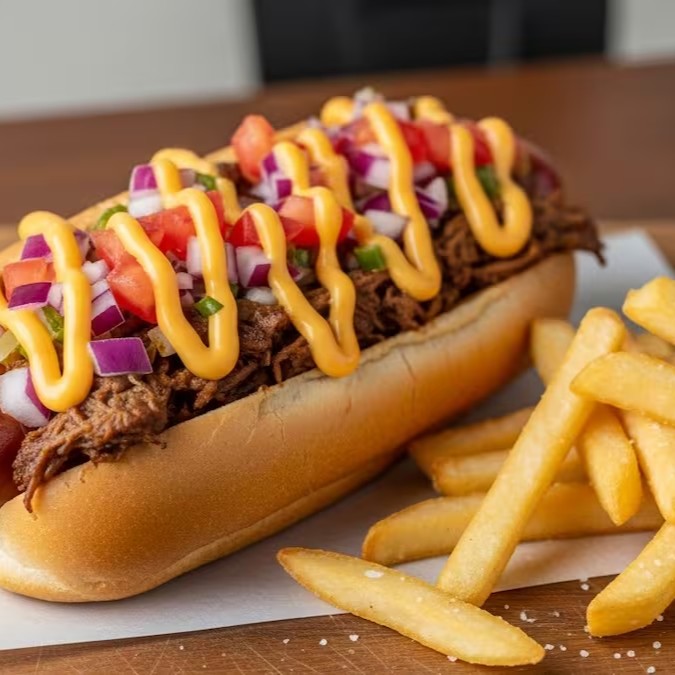 Um delicioso pão de hot dog com a nossa maionese crazy defumada, salsicha fininha, molho de tomate artesanal, carne louca (carne bovina desfiada com temperos e especiarias, pode conter pedacinhos de pimentão vermelho e amarelo), tomate picado com cebola roxa, para finalizar molho de cheddar. Acompanha batatas fritas palito 100g.