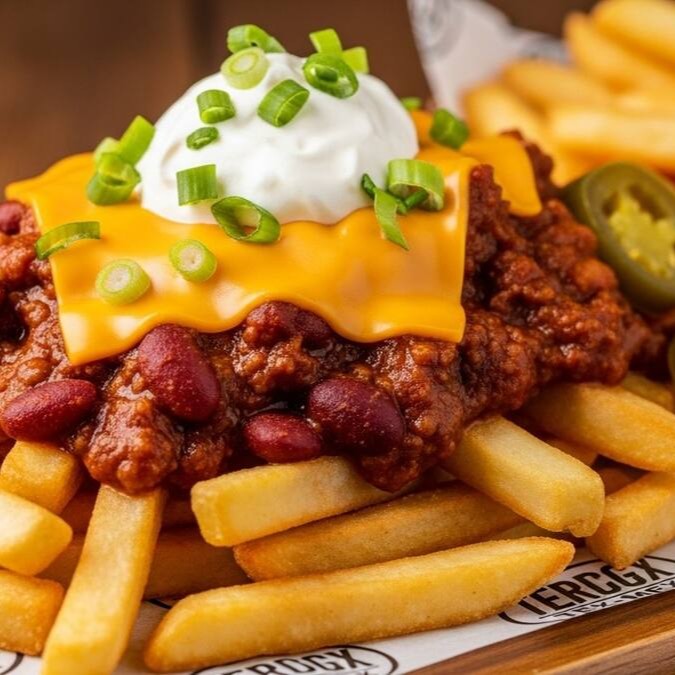 Batatas fritas 300g, cobertas com deliciosa carne com chilli mexicano (carne moida bovina, com pimenta chilli, feijão vermelho, temperos e especiarias), cheddar em fatias, finalizado com sour cream e pimenta jalapeno.