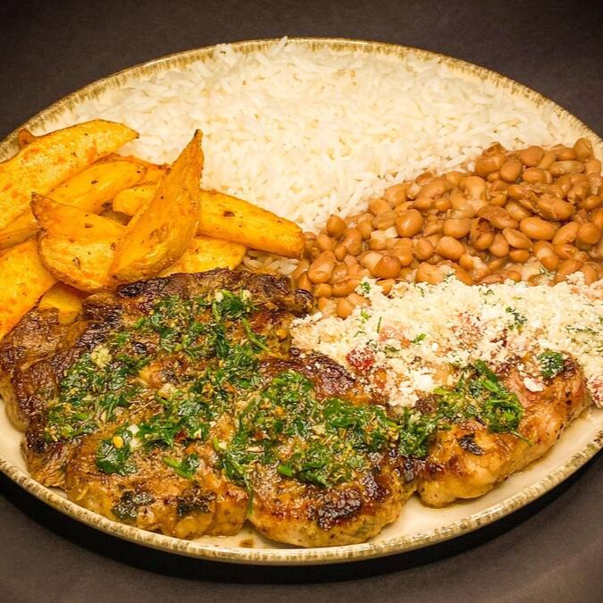 Prato executivo feito delicioso bife de contra filé bem temperado e finalizado com molho chimichurri. Acompanhado de arroz branco, feijão branco e batata rústica e farofa da casa!