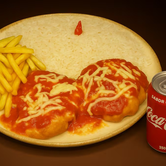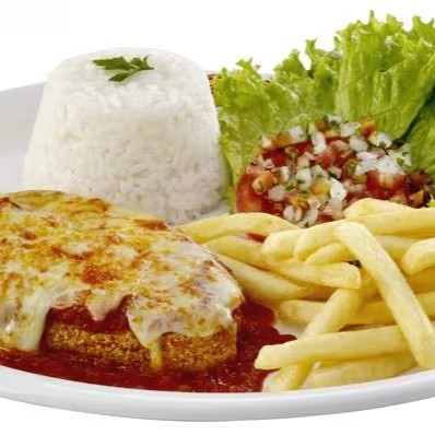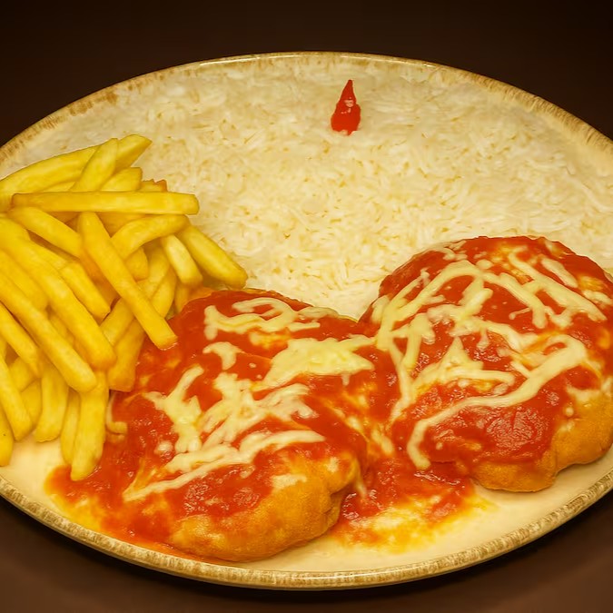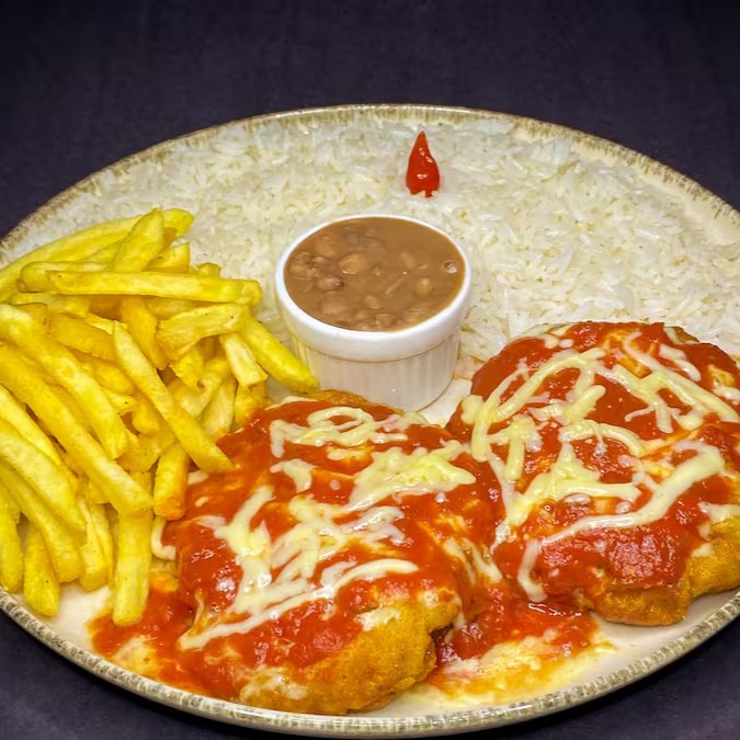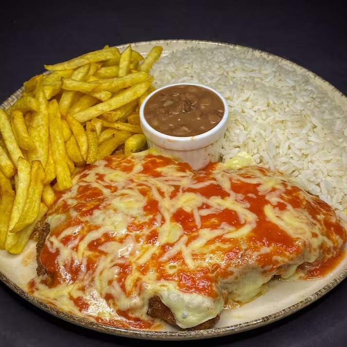 Prato executivo feito com um pedaço generoso da nossa alcatra suculenta empanada e finalizada com nosso molho de tomate caseiro e mussarela derretida. Acompanhado de arroz branco soltinho, feijão branco e batata frita!