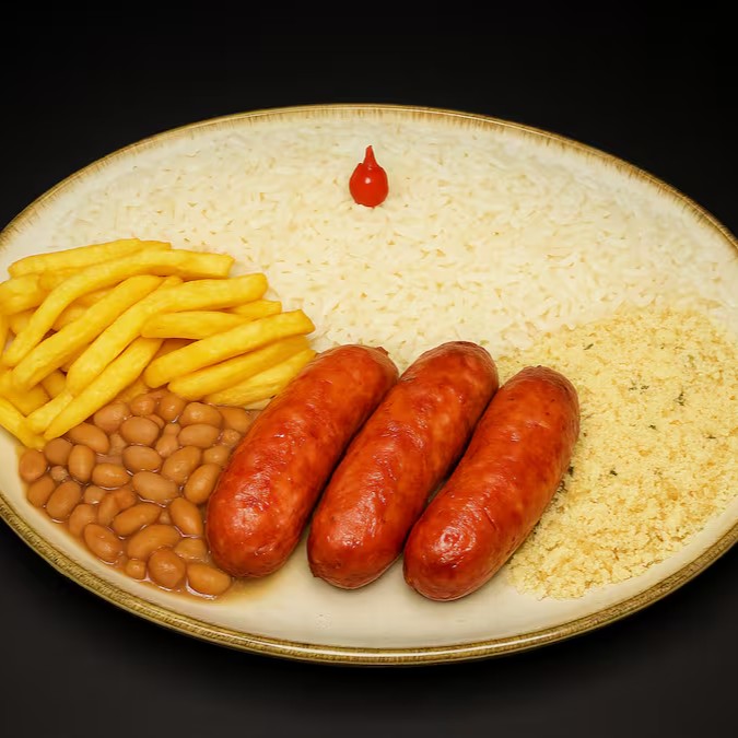 Prato executivo feito com um 02 deliciosas linguiça toscana firmeza assada. Acompanhado de arroz branco soltinho, feijão branco, batata frita e farofa da casa.