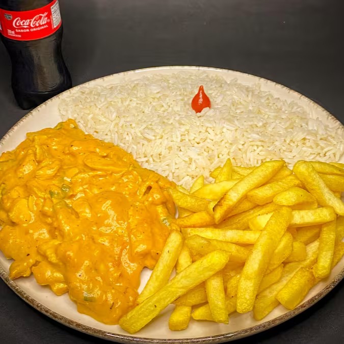 Prato executivo feito com tiras de frango bem temperada no delicioso molho caseiro do strogonoff. Acompanhado de arroz branco e batata frita!