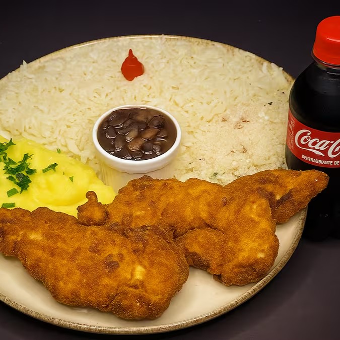 File Frango Sassami Empanado(arroz+feijão+purê Batata+farofa) Grátis Coca-cola 200ml