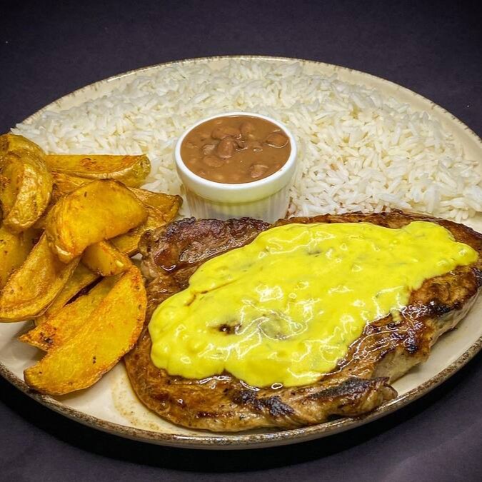 Prato executivo feito com um pedaço generoso da nossa alcatra suculenta e bem temperada. Acompanhado de arroz branco soltinho, feijão branco, batata rústica e finalizada com nosso delicioso molho artesanal de mostarda.