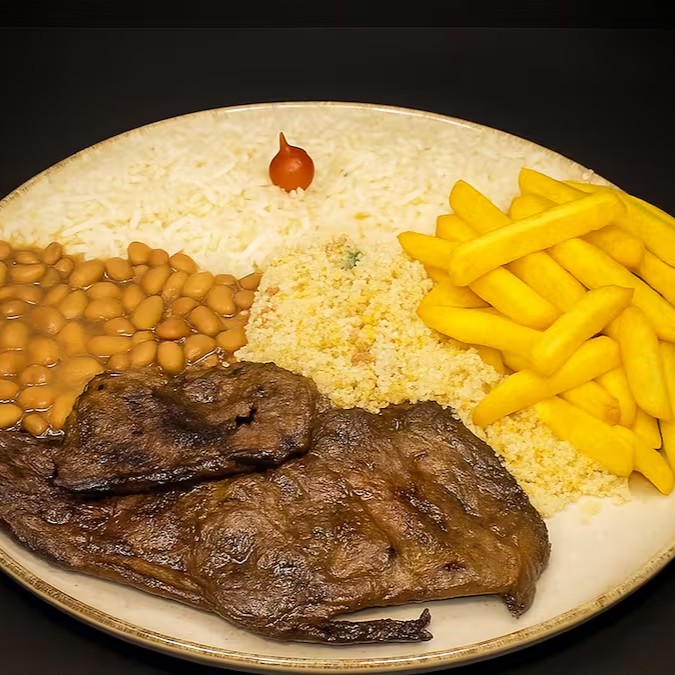 Acompanhado de arroz branco soltinho, feijão branco, batata frita, farofa da casa e vinagrete!