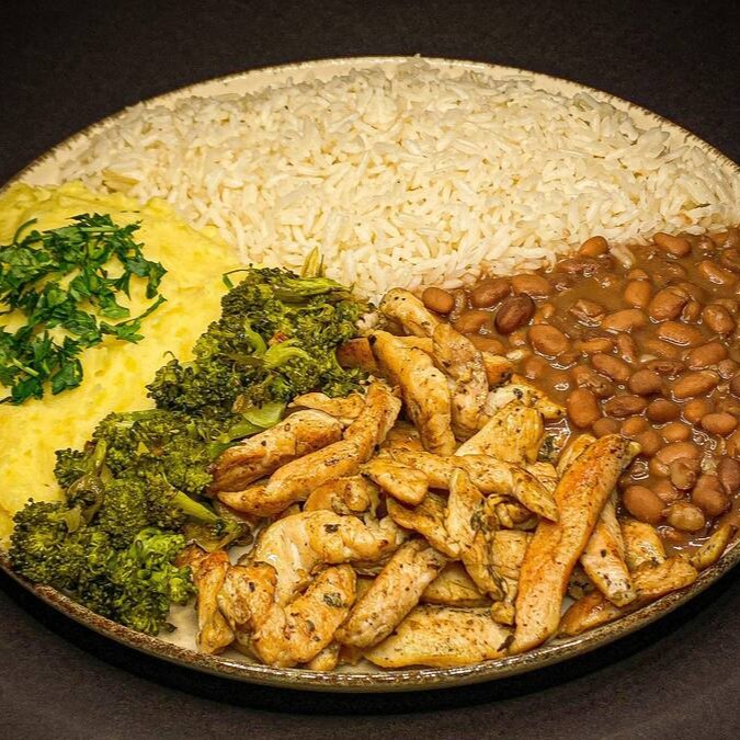 Delicioso prato executivo feito tiras de frango grelhado com purê de batata. Acompanhado de arroz branco soltinho, feijão branco e brócolis cozido.