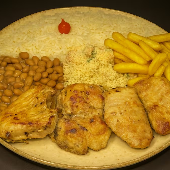 Filé de frango grelhado, macio e saboroso, servido com arroz soltinho, feijão branco bem temperado, farofa caseira e batata frita crocante.